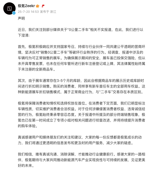 在被媒体曝出销售“0公里二手车”后,极氪官方发声明否认。